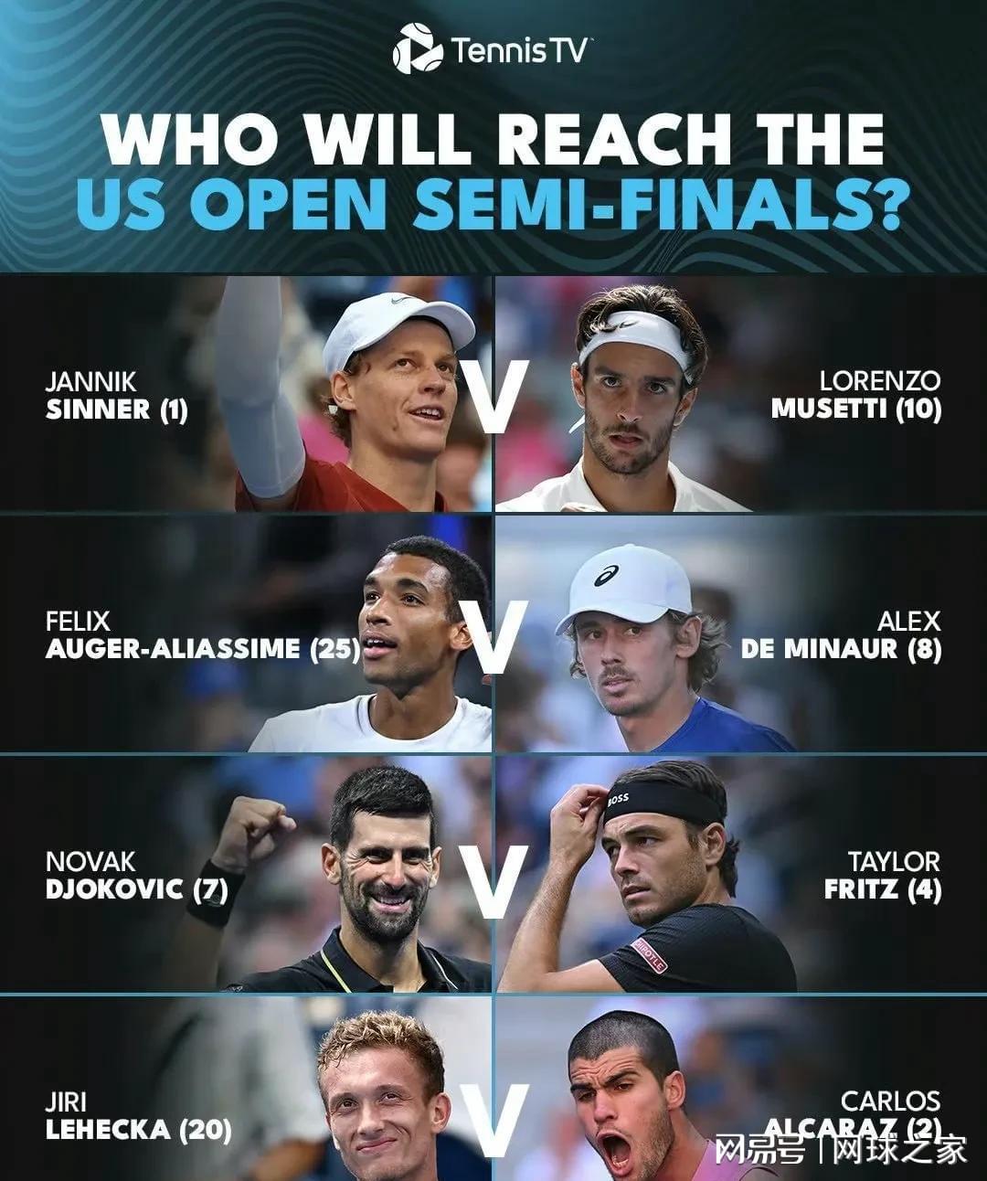 女单的八强阵容拉满了外界的期待,由辛纳、穆塞蒂、阿利亚西姆、德米纳尔、德约、弗里茨、莱赫卡和阿尔卡拉斯组成的男单八强阵容也十分有趣,球迷和网友们直接将今年的美网男单八强阵容形象地称为:七小伙围剿一个老人。