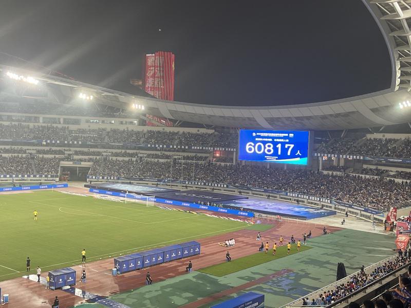 “加油徐州队!加油南京队!……”比赛现场,闷热的高温天气也燃不过球迷的热情,比赛现场共有60817位观众入场观赛,刷新了上个主场对盐城60633人的上座纪录,再创“苏超”单场观赛人数新纪录。南京奥体中心体育场看台上,球迷们此起彼伏的呐喊声震耳欲聋,全场人用满满的激情将赛场化作一片沸腾的海洋,“南北双雄会,绿茵共苏超”、“为宁而战,注定不凡”,球场周围被各种标语横幅包装得氛围满满。值得一提的是,南京市域内各大商场、特色街区精心搭建了观赛“第二现场”,市民们为赛事呐喊助威同时还能享受专属观赛福利、趣味商场活动,让大家共赴赛场激情、畅品美食盛宴。